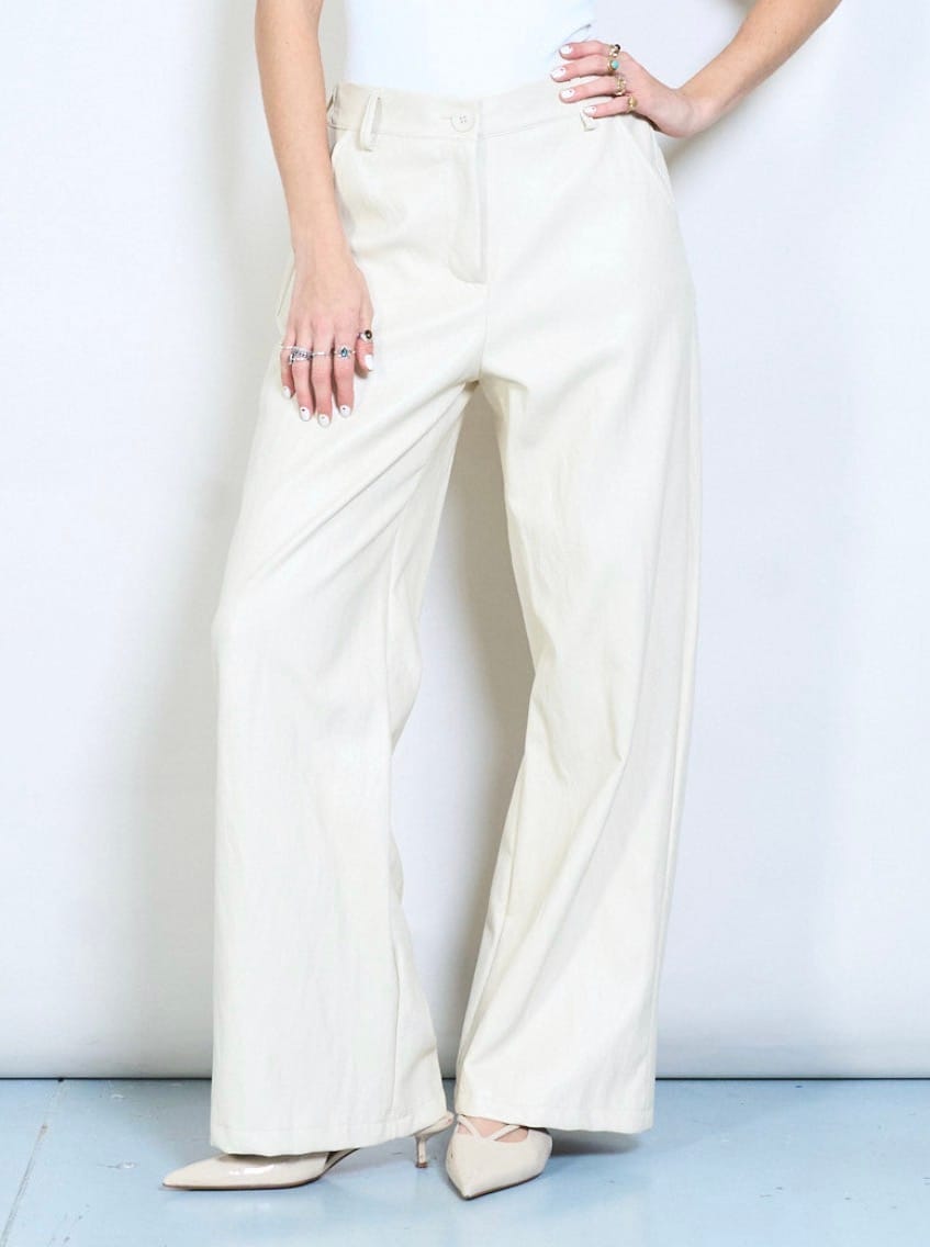 Deze crème wide leg leren broek is een echte eyecatcher voor een stijlvolle en moderne look. Het soepele leer voelt luxe aan en valt prachtig langs het lichaam. De hoge taille en wijde pijpen zorgen voor een elegant silhouet en een comfortabele fit. Perfect te combineren met een fijne knit, blouse of blazer voor een chique look.