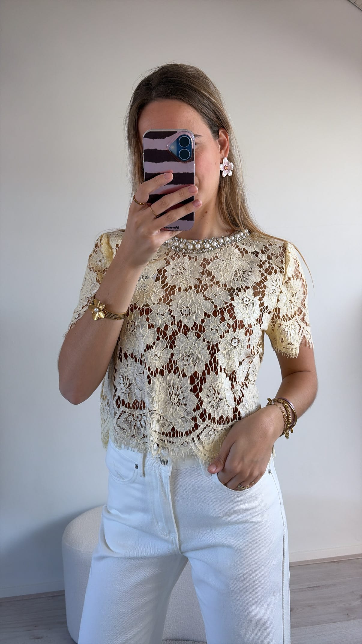 Deze lichtgele kanten top met korte mouwen is een echte must-have voor een vrouwelijke en frisse look. Het verfijnde kant geeft de top een elegante uitstraling, terwijl de zachte lichtgele kleur perfect past bij het voorjaar en de zomer. De top is makkelijk te combineren en staat prachtig op een witte broek, jeans of rok.