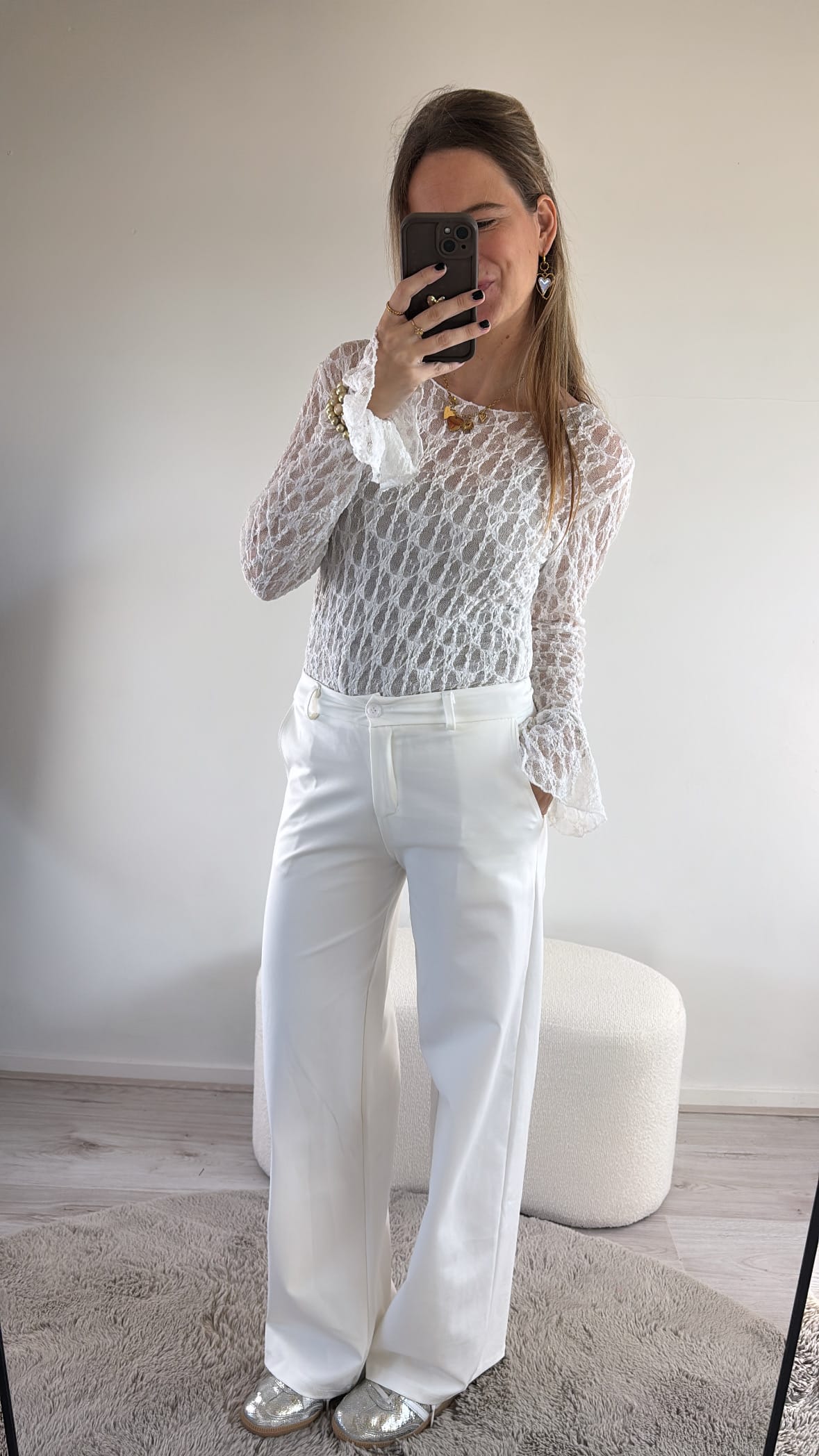 Deze elegante kanten damestop met ruffles bij de mouwen geeft je outfit een vrouwelijke en stijlvolle uitstraling. Het fijne kant zorgt voor een chique look, terwijl de speelse ruffles bij de mouwen een romantisch detail toevoegen.