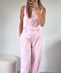 Roze damespak. Het pak heeft een wijde broek en een kortere top. De top heeft knopen aan de voorkant. De items zijn ook leuk los van elkaar te combineren.