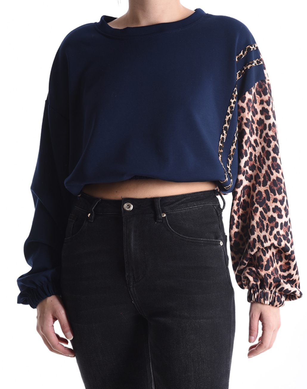 Speelse trui met panterprint. Aan de achterkant loopt de print door. De trui heeft een ronde hals en lange mouwen.