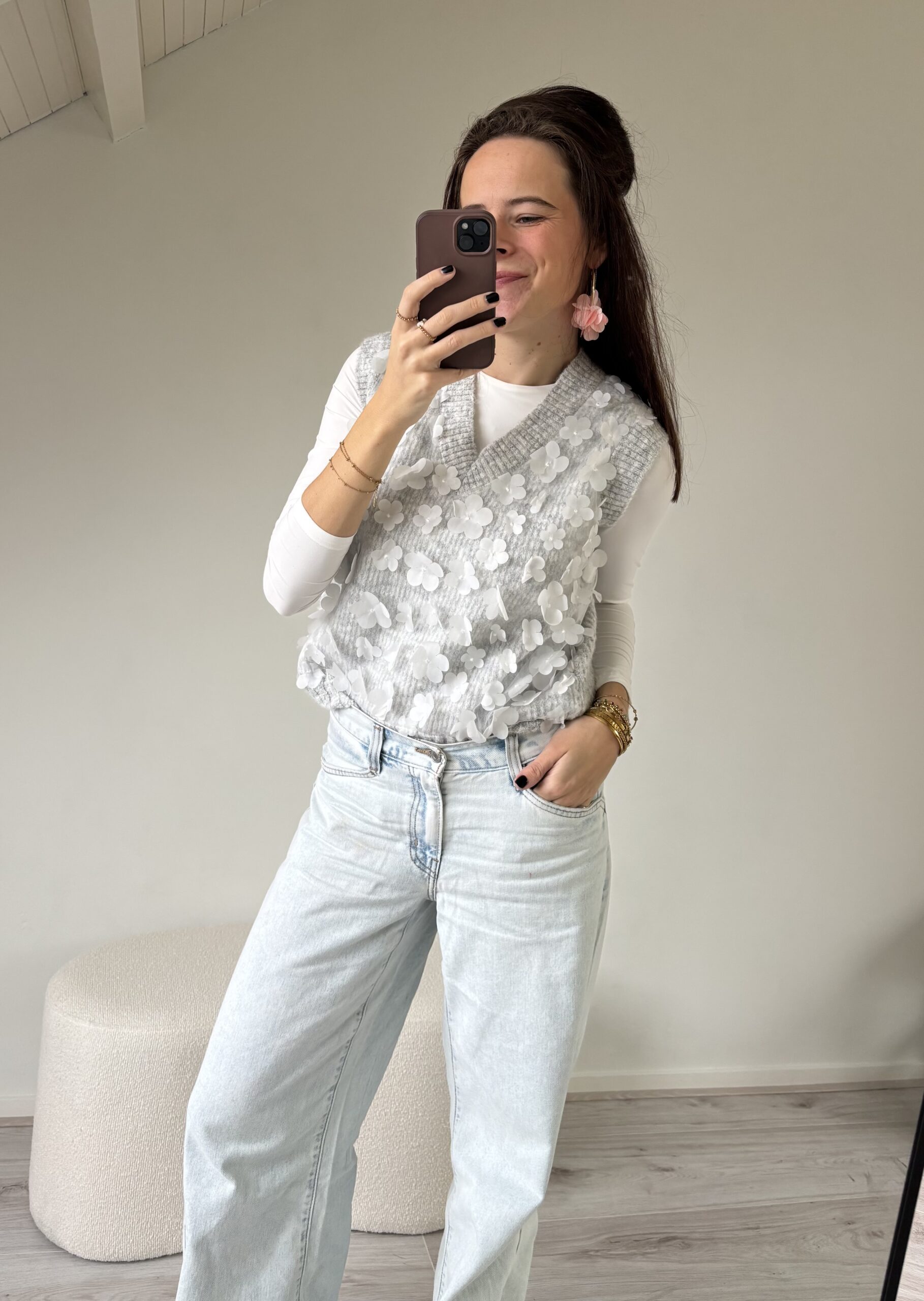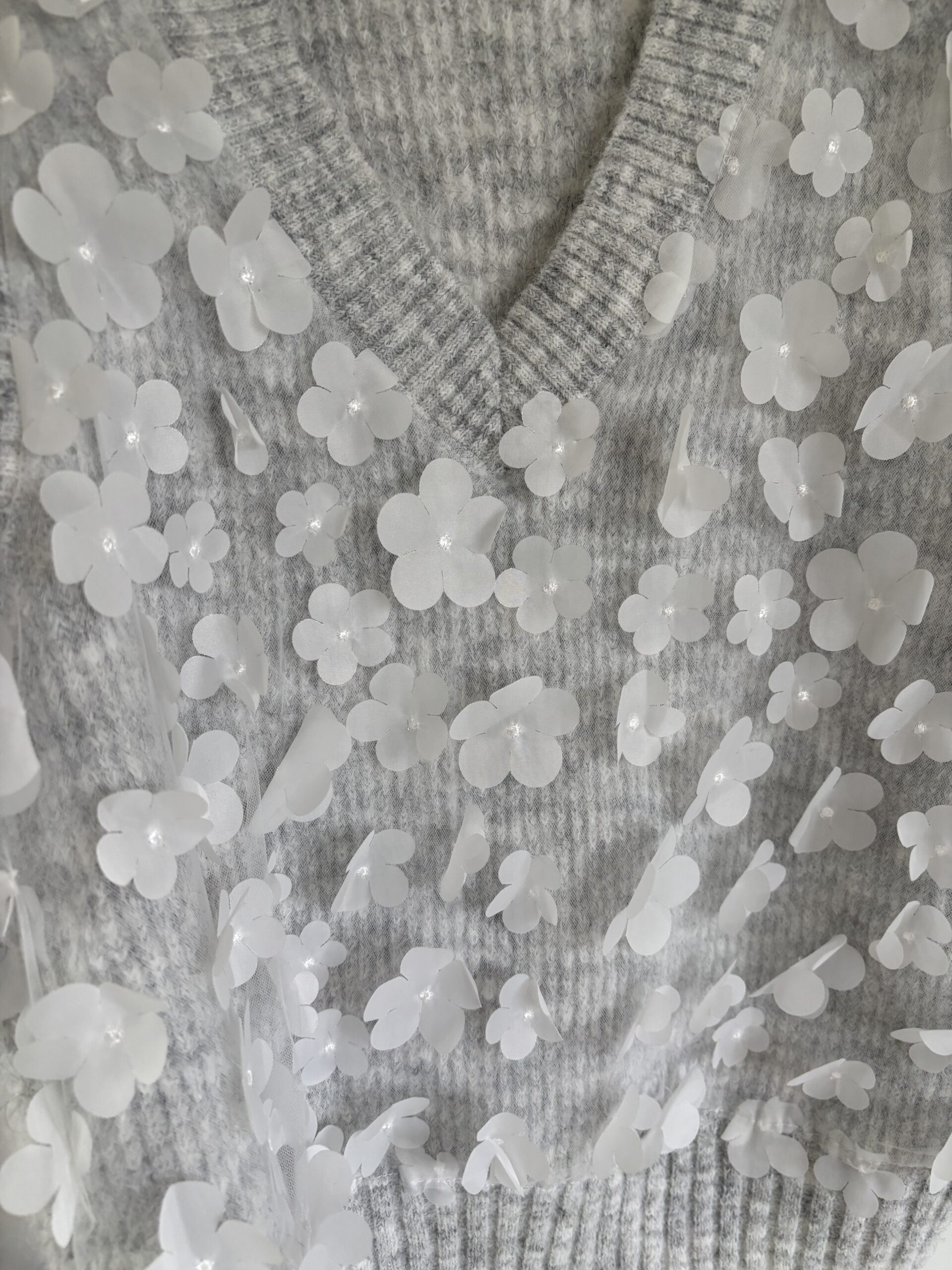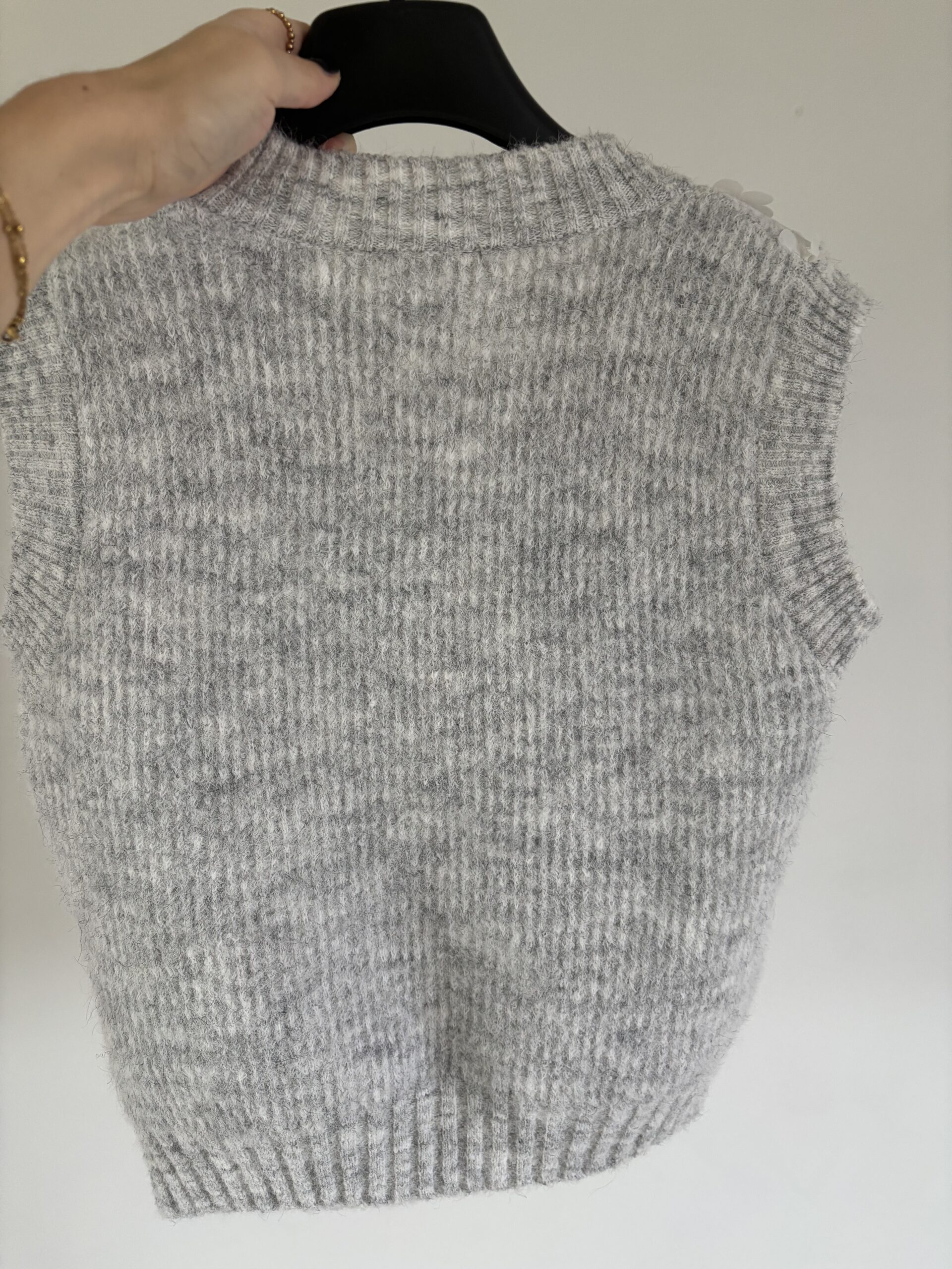 De mouwloze grijze trui heeft een v-hals. De trui heeft aan de voorkant bloemen en is aan de achterkant egaal.